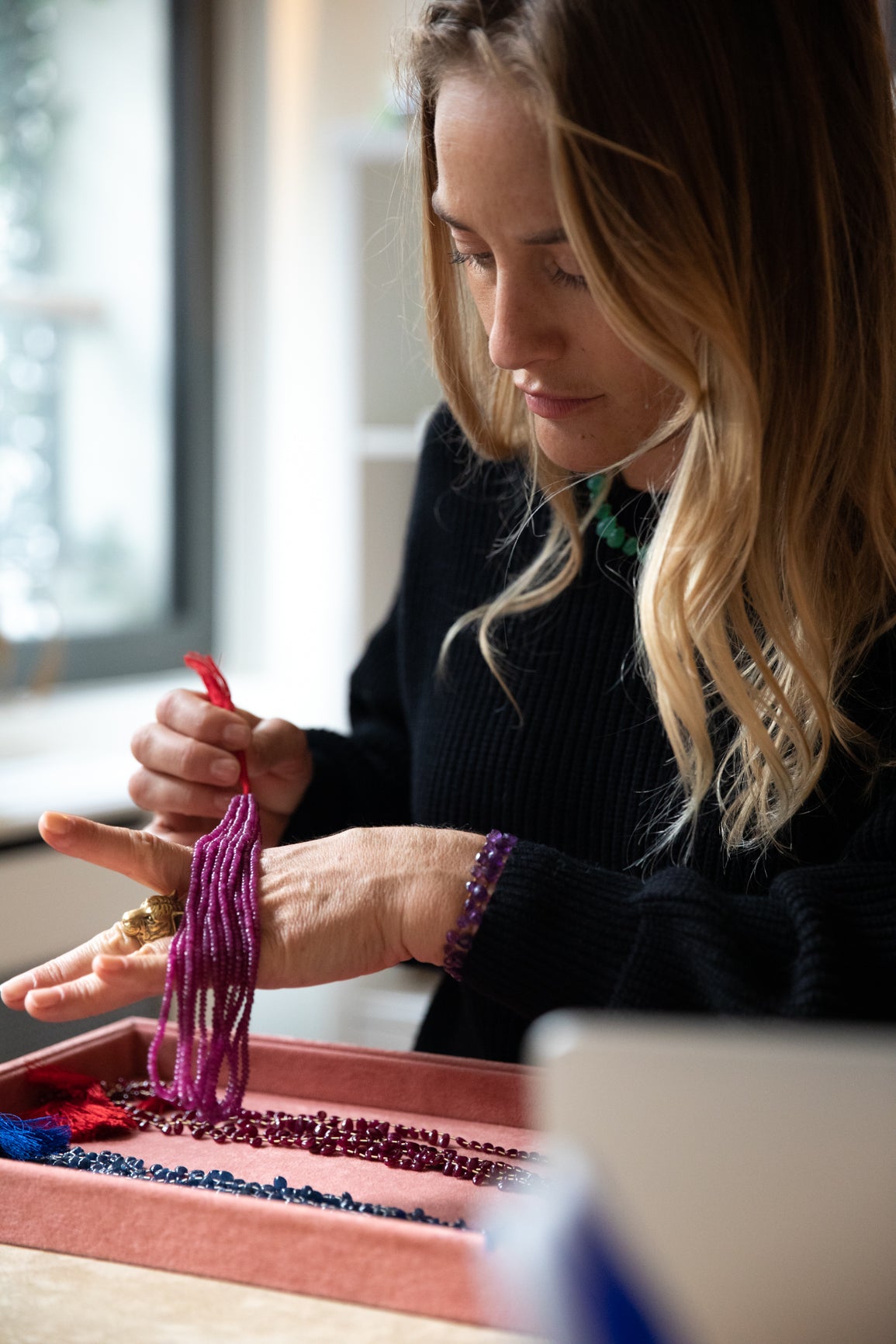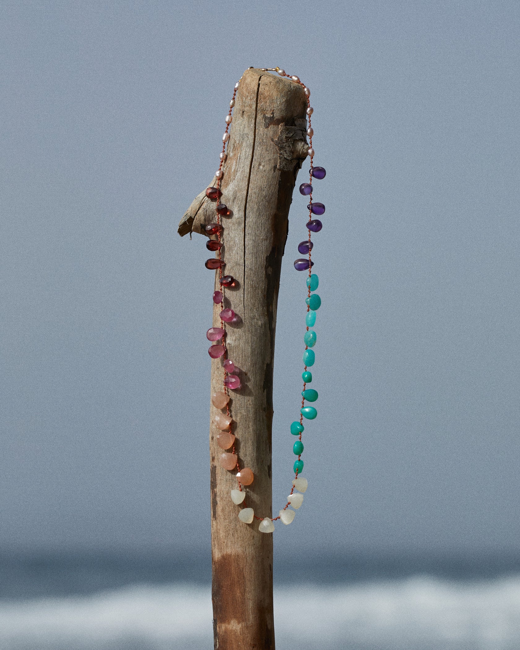 All our creations are handmade in France in our Parisian workshop. It is in India that we meticulously select the stones that make up our necklaces and bracelets. We adopt them as they have organically formed in the depths of the earth. We allow ourselves to be guided quite simply by the emotion they provide in their raw and natural state, cherishing all their irregularities. The stones are polished, cut, faceted and do not receive any treatment. The colours and nuances remain natural, which makes it possible to create soft and harmonious gradients. We work with several stone cutters, all of whom work with respect for human rights. The two main companies we work with are run by women. We have a special connection with them that facilitates our relationship.
