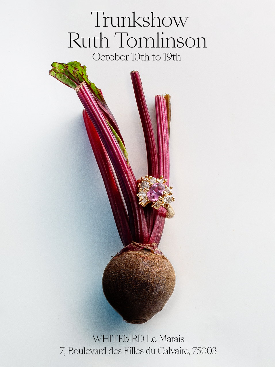 WE ARE PLEASED TO PRESENT RUTH TOMLINSON'S LATEST CREATIONS, DURING A SPECIAL TRUNKSHOW IN OUR MARAIS SHOP FROM OCTOBER 10TH TO 19TH 2024. YOU CAN ALSO ADMIRE AND PURCHASE RUTH TOMLINSON'S TREASURES ON OUR E-SHOP. TO CELEBRATE RUTH'S EXHIBITION AT WHITEBIRD, WE HAVE SAT DOWN WITH THE DESIGNER AND ASKED HER A FEW QUESTIONS TO KNOW MORE ABOUT HER HISTORY, INSPIRATIONS AND HER FAVORITE PIECES FROM HER LATEST COLLECTION...