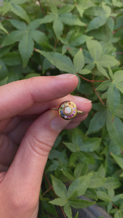Cette bague lumineuse en or jaune et pierres précieuses gravite sur le doigt à la manière d'un ovni précieux dans la galaxie. À la fois vibrante, ludique et tendre, cette bague détaillée tourne sur elle-même une fois portée. Inspirée par notre système solaire, elle est méticuleusement conçue par Sofia, dans son atelier de Montréal pour le plus grand bonheur des rêveurs un poil extravagants.