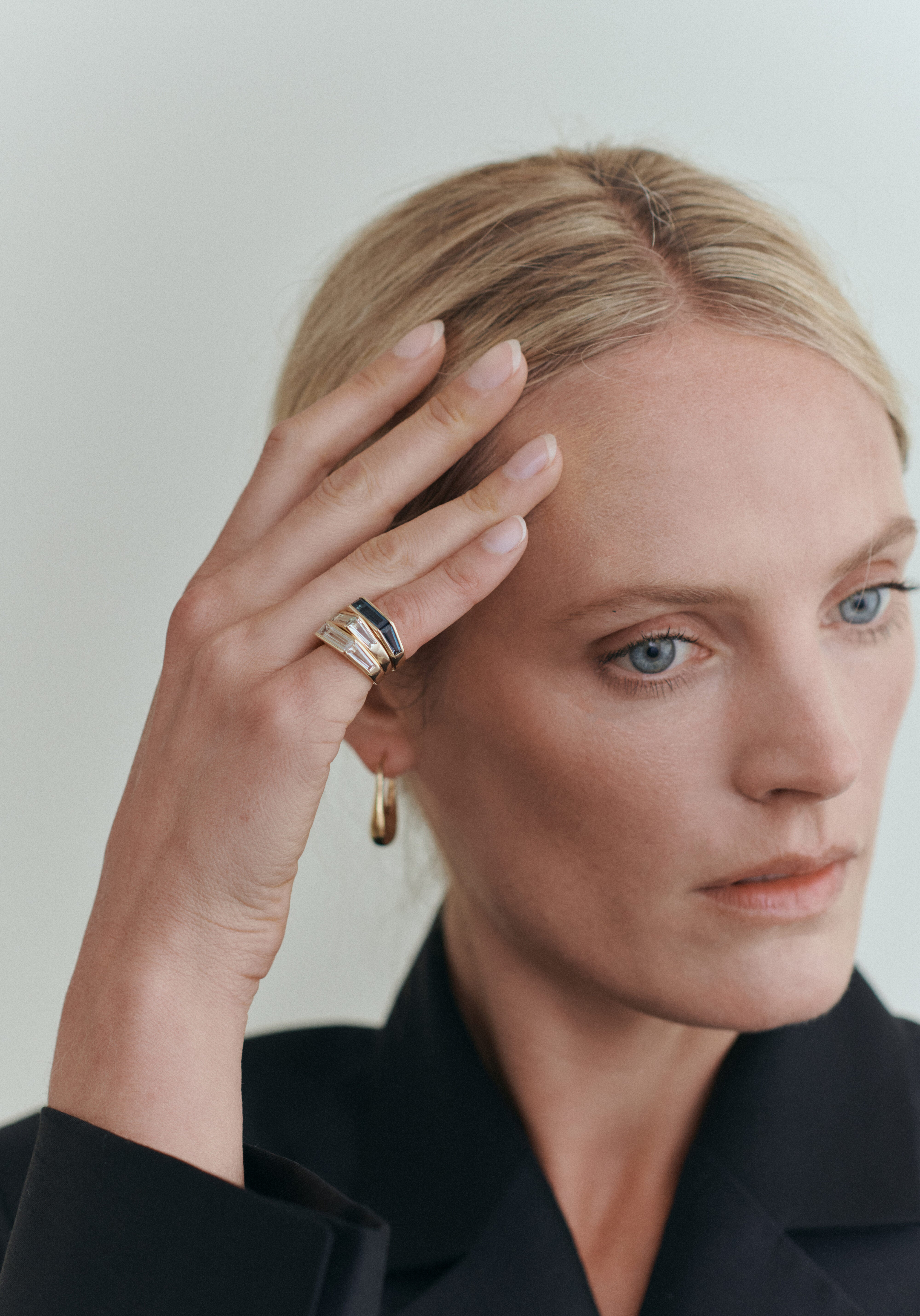 I wear my classic ring stack in Moss Agate everyday – the rings are simple, tactile and playful, but once combined they create magic. I love the unadorned hard stone, sparkling diamond pave and simple gold highlighting the natural beauty of the materials they’re made of.