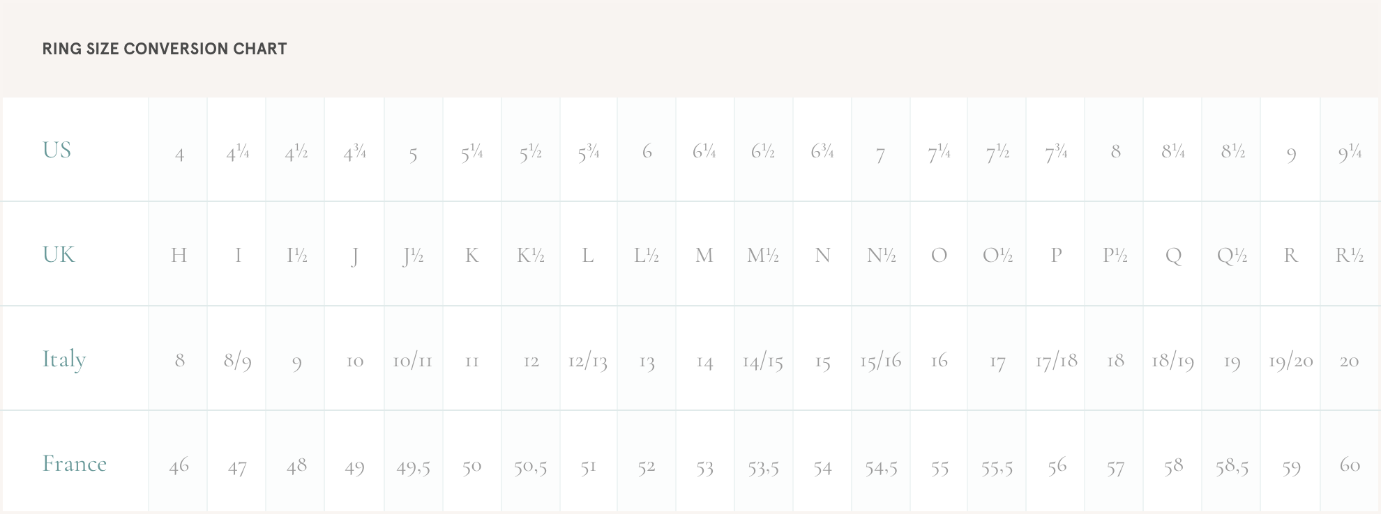 You will find below our tab to help you choose your ring size. For other measurements (bracelets or necklaces) do contact us if you need an advice.