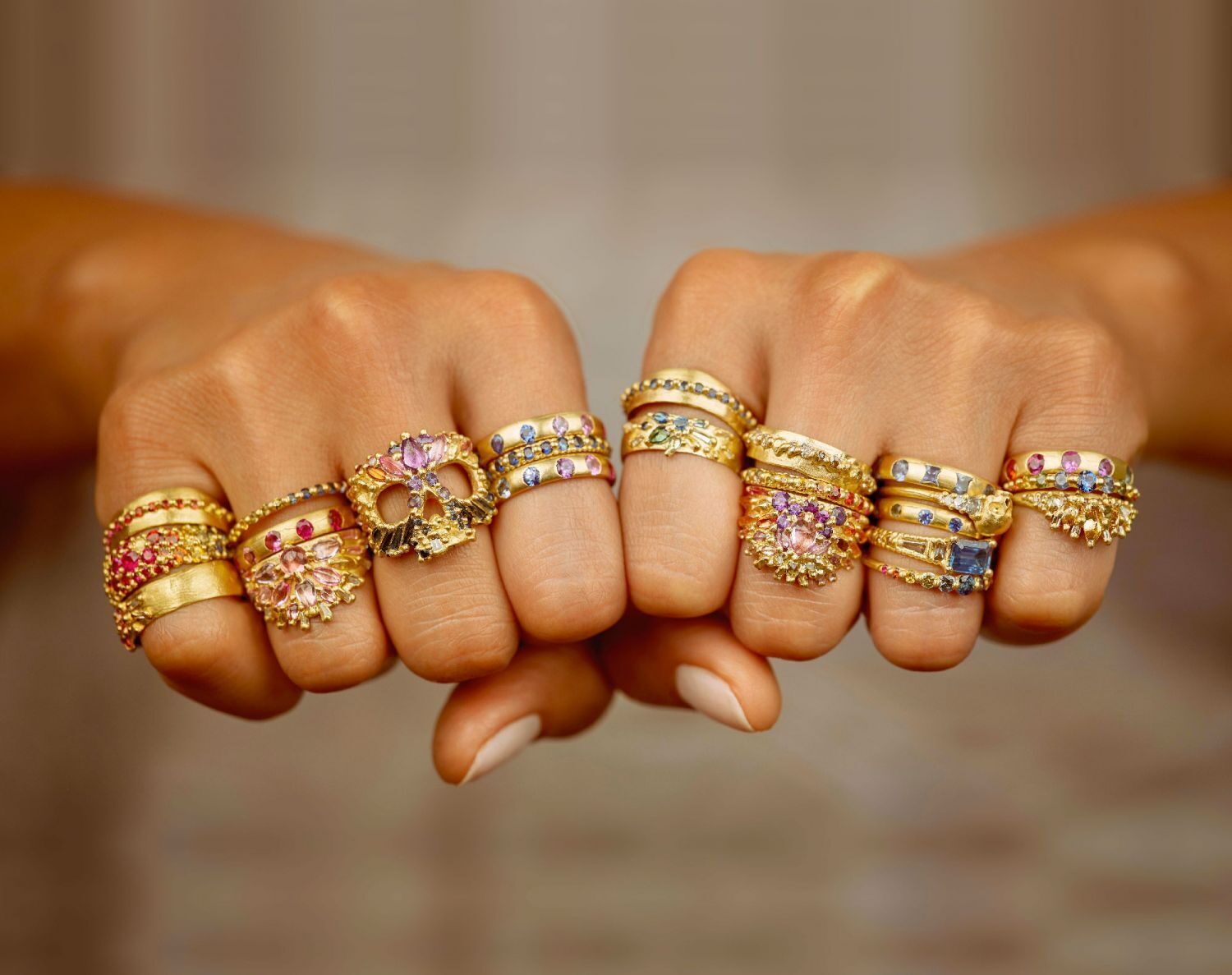 Les saphirs et les diamants sont les pierres qui se prêtent le mieux à notre technique de sertissage « cast not set ». J’adore la palette de couleurs que m’offrent les saphirs ; grâce à eux, je peux véritablement capturer l’arc-en-ciel dans nos créations. Au fil des années, je suis tombée amoureuse des diamants. Les diamants froids, parfaits et sans défaut me laissaient un peu indifférente, mais en apprenant à mieux les connaître, je suis tombée sous le charme de leurs cousins et sœurs : les anciennes tailles de mineurs où l’on peut admirer les facettes taillées à la main, les diamants « sel et poivre » dont les inclusions et les couleurs confèrent aux pierres un caractère unique, et la chaleur onctueuse des diamants champagne et cognac qui me remplit de joie.