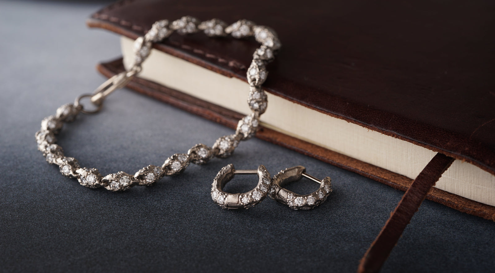 L'or jaune ou blanc 14 carats, son métal de prédilection pour sa douceur, sertit de petits diamants avec une rare délicatesse. Un éclat subtil, une patine naturelle et le refus de Noguchi de suivre les tendances confèrent aux bijoux un caractère intemporel, sans pour autant altérer leur allure contemporaine.