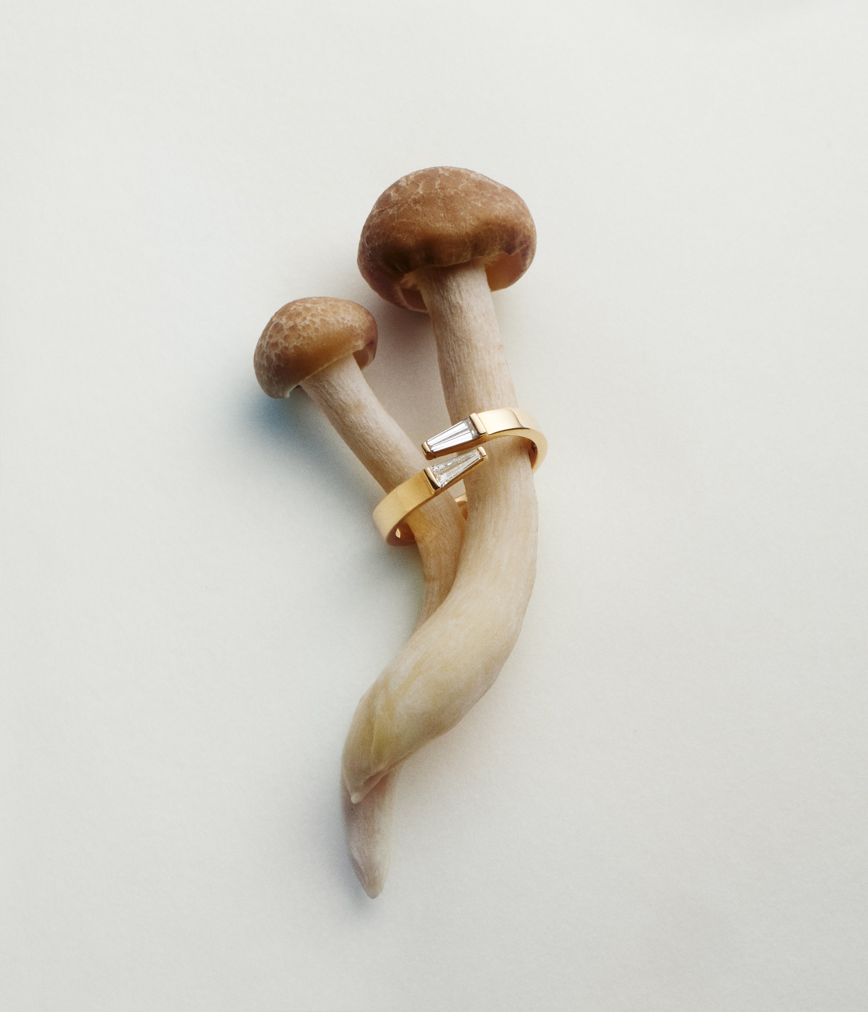 Dans son atelier parisien, elle travaille l'or recyclé 18 carats, façonnant chaque pièce avec une précision organique. Ses bagues « navette » taille marquise, ses chaînes aériennes et ses formes minimalistes reflètent une esthétique moderne et fluide, ancrée dans le quotidien. Chaque pierre est sélectionnée avec soin, dans le respect d'une vision responsable et consciente de l'art de la joaillerie.
