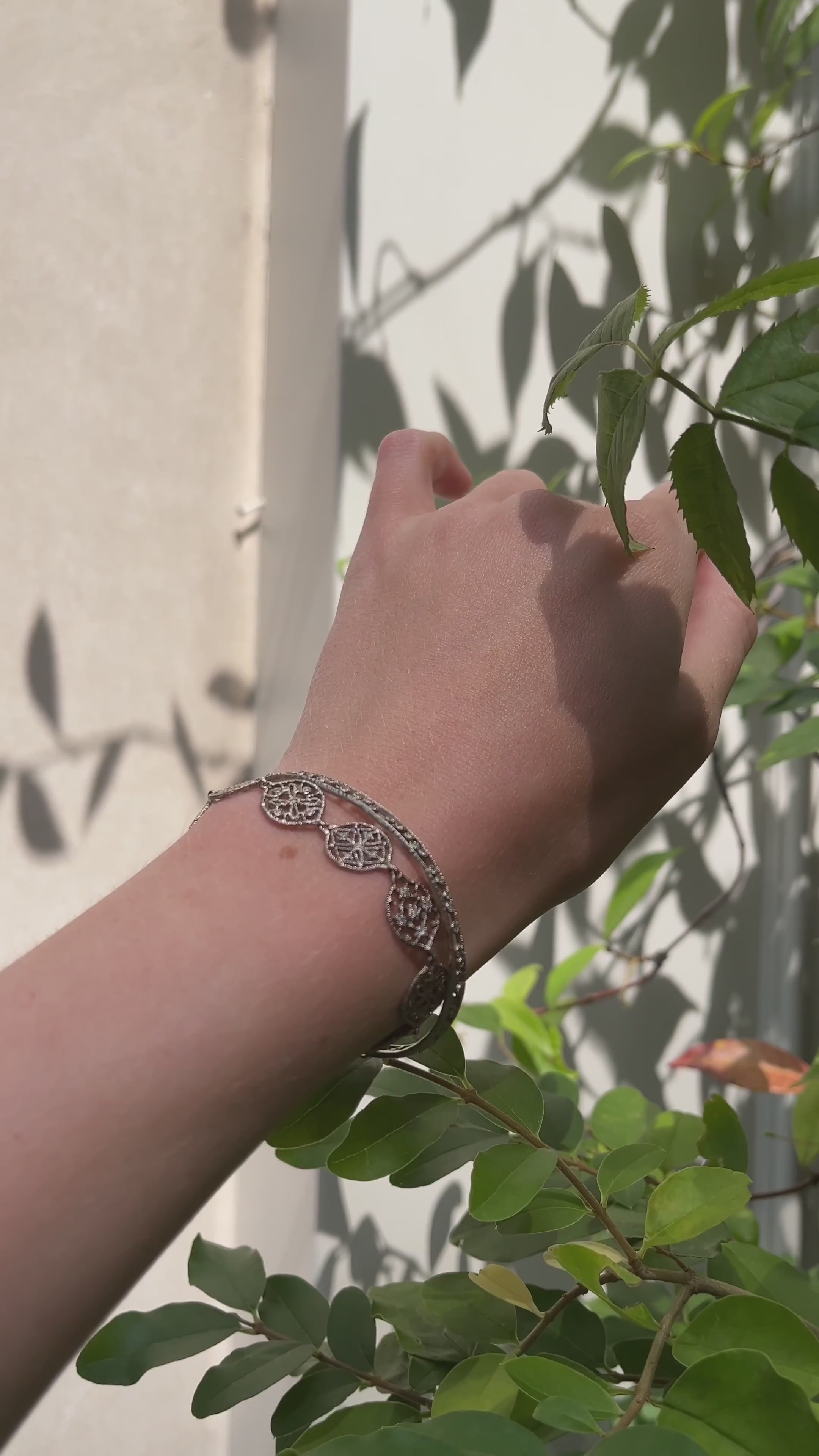Ce bracelet léger, composé de différentes pastilles d'or gris 14 carats ciselé et de diamants parsemés, évoque un bijou ancien. Toute en discrétion, comme son designer japonais qui travaille à l'écart des feux de la rampe, c'est une pièce très fine, délicate à l'extrême avec sa patine appliquée pour lui donner un aspect ancien. Du bel ouvrage!